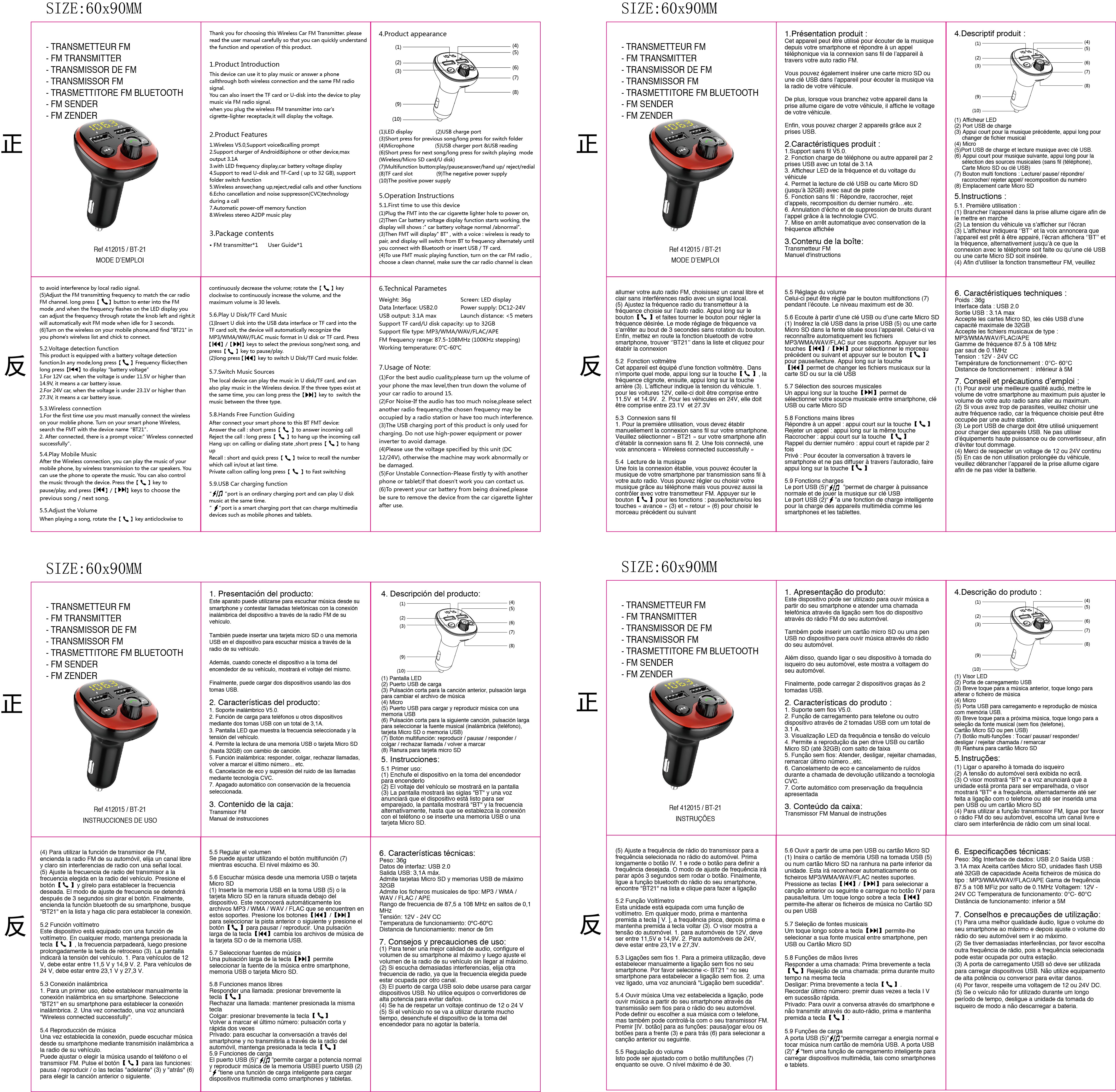 Ce produit possède deux chargeurs USB (3,1A total cumulé), un lecteur de carte micro SD. Il est aussi équipé d'un micro afin de passer vos appels en sécurité. Permet d'écouter de la musique ou une conversation téléphonique d'un appareil bluetooth sur la radio de votre véhicule.