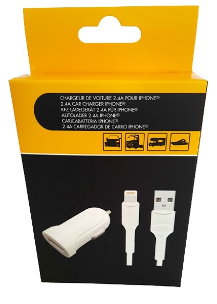 Chargeur allume cigare 12V / 24V USB A 2.4 A avec câble iPhone 1m