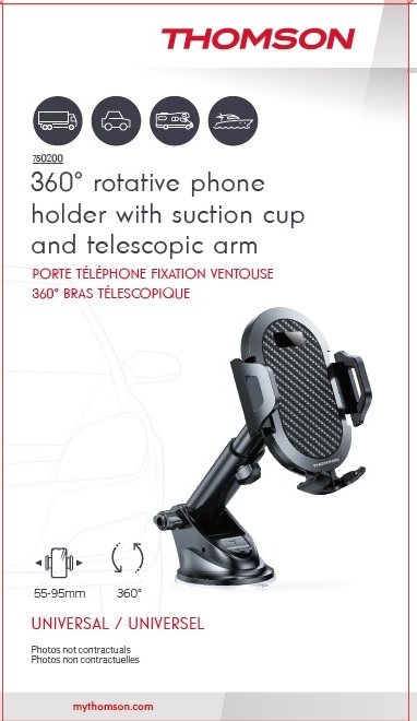 Le bras est orientable à 180° pour un positionnement horizontal ou vertical. Largeur du porte téléphone ajustable de 53 à 95mm